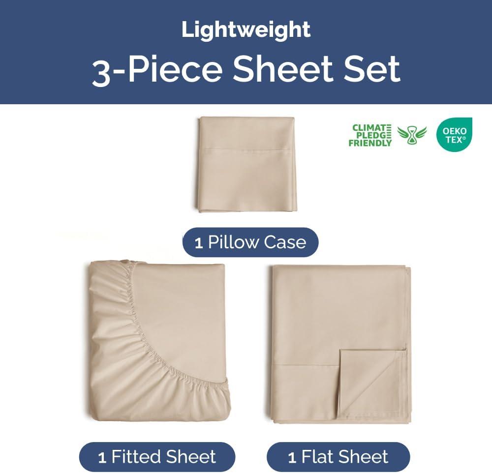 3 PIECE SHEET SET TWIN SIZE: Experience the ultimate in comfort with our lightweight, cooling and breathable sheet set. This bed set includes a flat sheet (96″ x 66″), a fitted sheet (75″ x 39”), and 1 pillowcase (20″ x 30″), all crafted for lasting durability and superior performance.