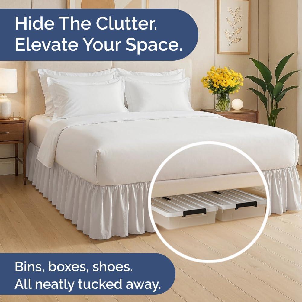 BEDSKIRT QUEEN SIZE RUFFLE: Conceal unsightly box springs, bed frames, and under-bed storage with this Queen-size dust-ruffled bed skirt. Its platform-friendly, lay-flat design delivers an elegant, luxury finish—perfect for women, men, kids, and teens.