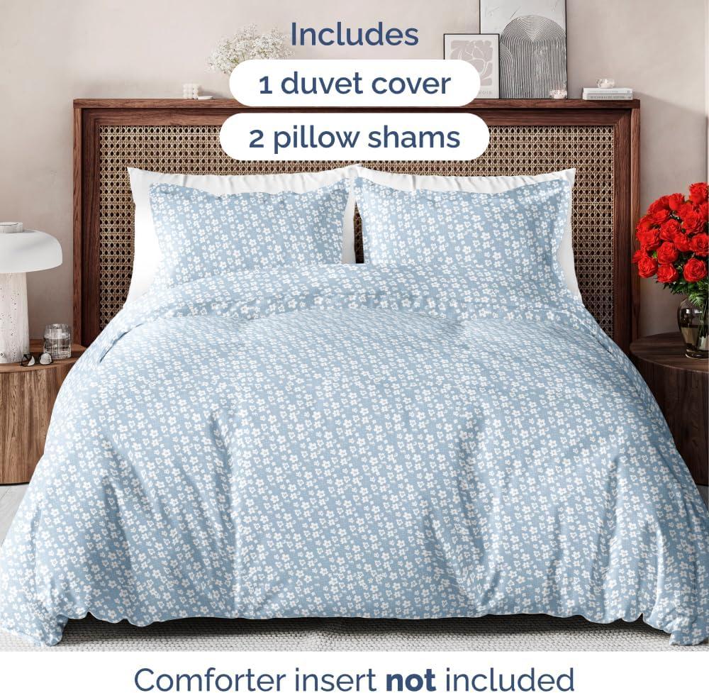 Duvet Cover Queen Size Set - Extra Soft Floral Duvet Cover 90 x 90 with 2 Pillow Shams - Comfy, Breathable Floral Bedding Set - Hotel Luxury Easy-Care & Fade Free with Zipper Closures & Ties - Plants(Blue Meadow (No Comforter))