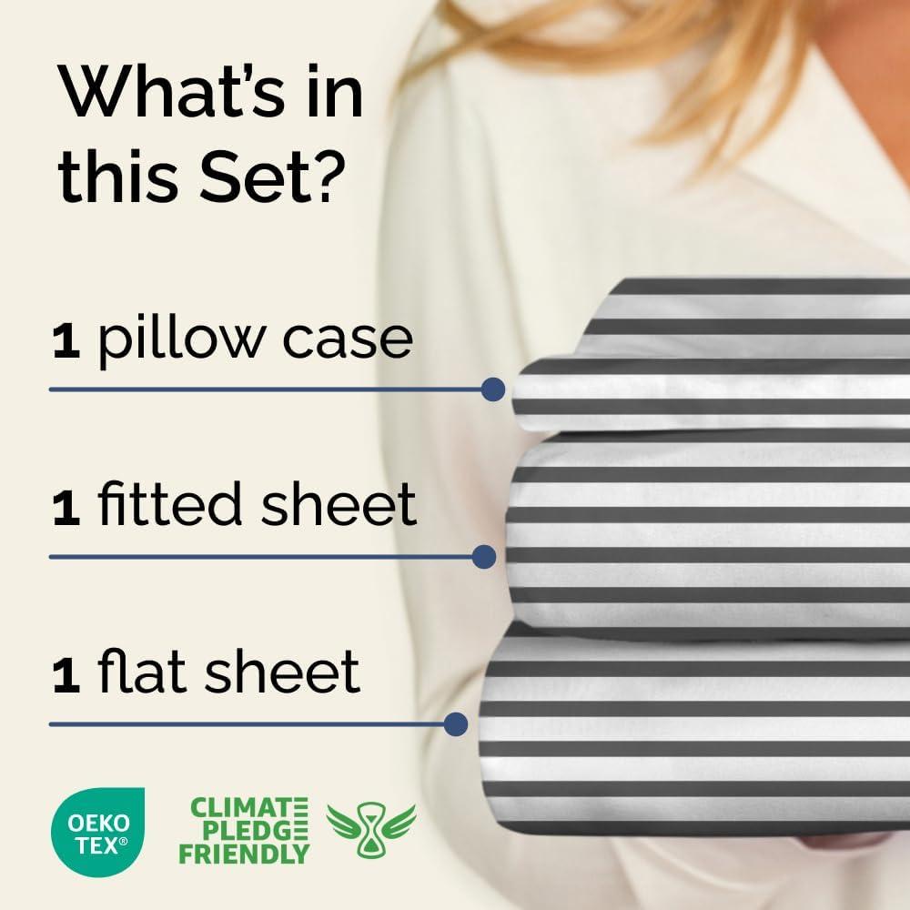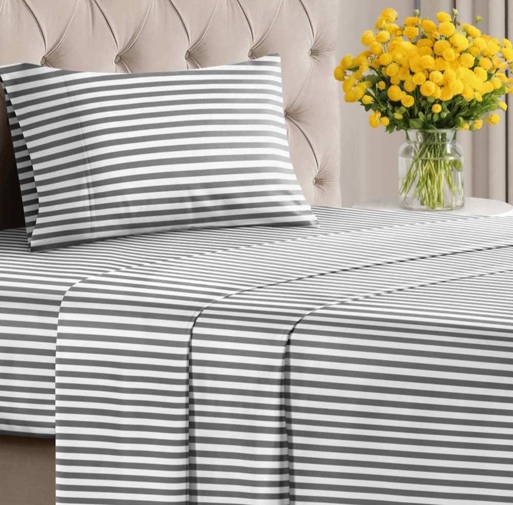 GREY STRIPED SHEETS: Featuring a classic Grey & White striped design, this ultra-soft, wrinkle & fade-resistant set boasts deep pockets for a secure fit and is crafted from premium, breathable fabric—perfect for a stylish, easy-care bedroom upgrade.