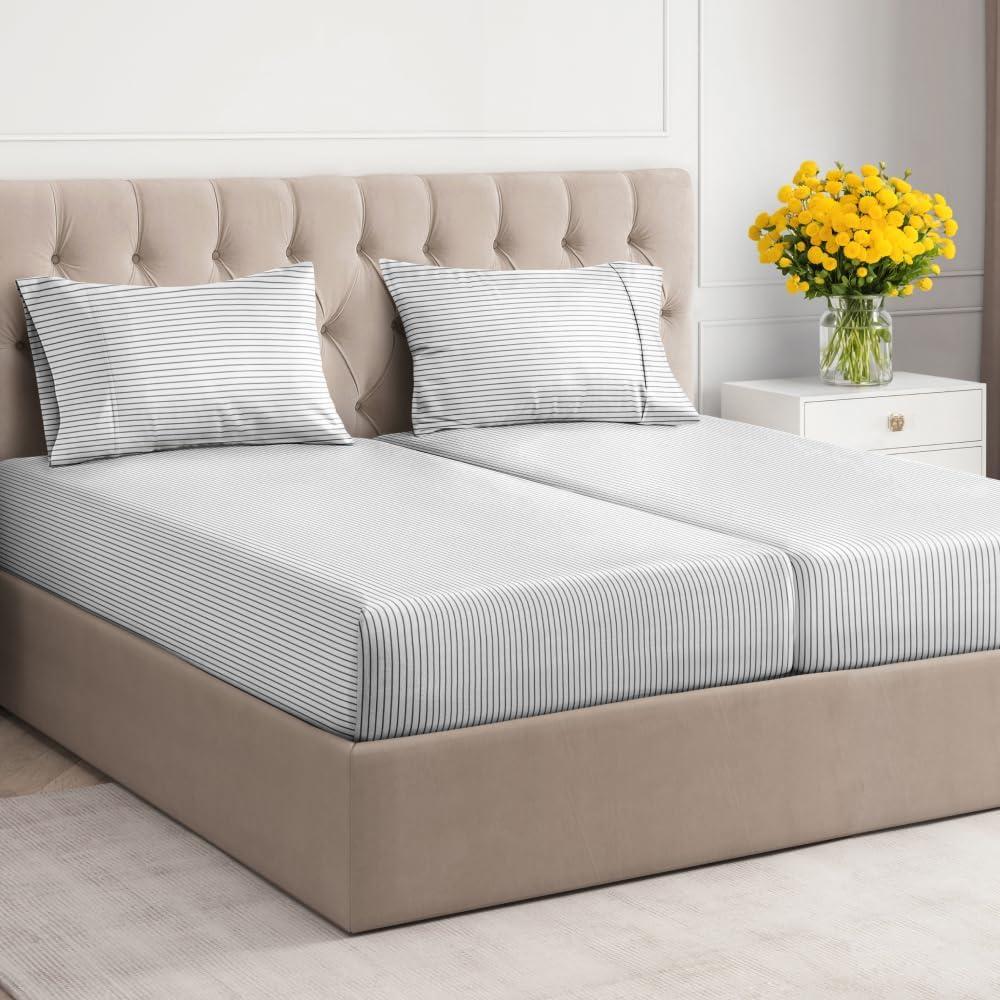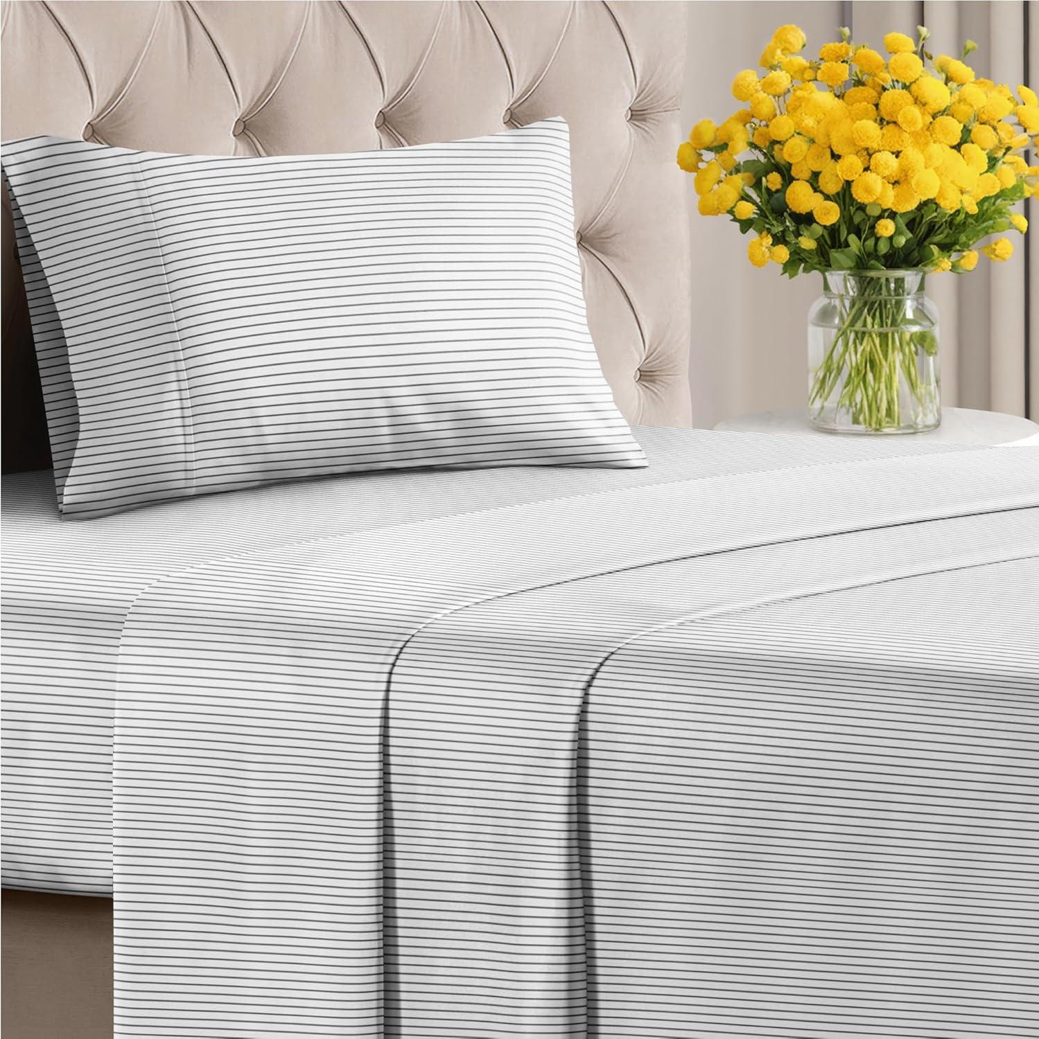 GREY STRIPED SHEETS: Featuring a classic Grey & White striped design, this ultra-soft, wrinkle & fade-resistant set boasts deep pockets for a secure fit and is crafted from premium, breathable fabric—perfect for a stylish, easy-care bedroom upgrade.